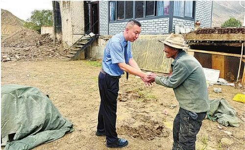 今年7月援藏期间,张彪(左)走访西藏自治区昂仁县秋窝乡杰村,慰问当地困难群众。